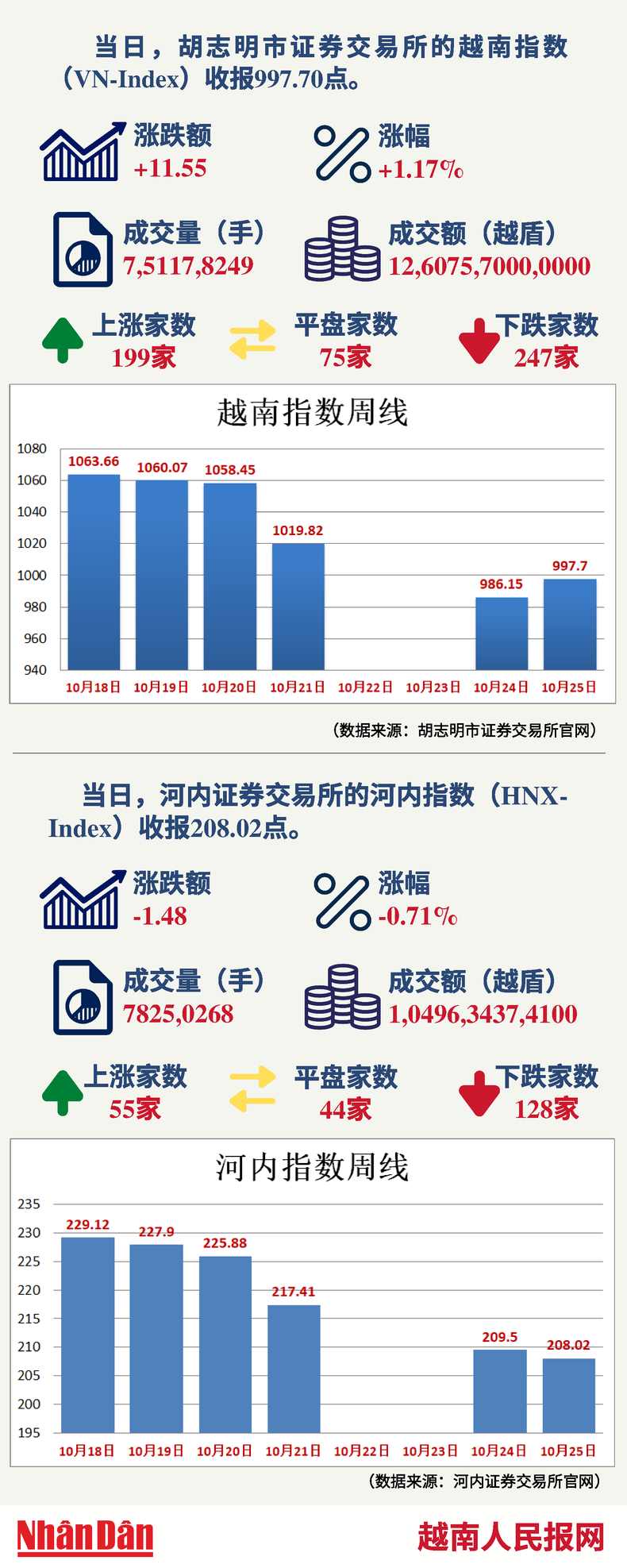 当天,胡志明市证券交易所的越南指数(VN-Index)和河内证券交易所的河内指数(HNX-Index)分别收报997.70点和208.02点。