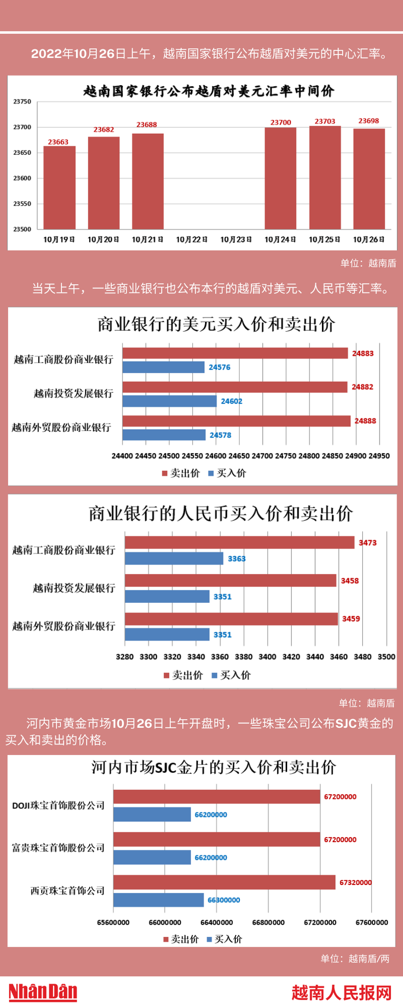 2022年10月26日上午,越南国家银行所公布的越盾对美元的中心汇率为23698。