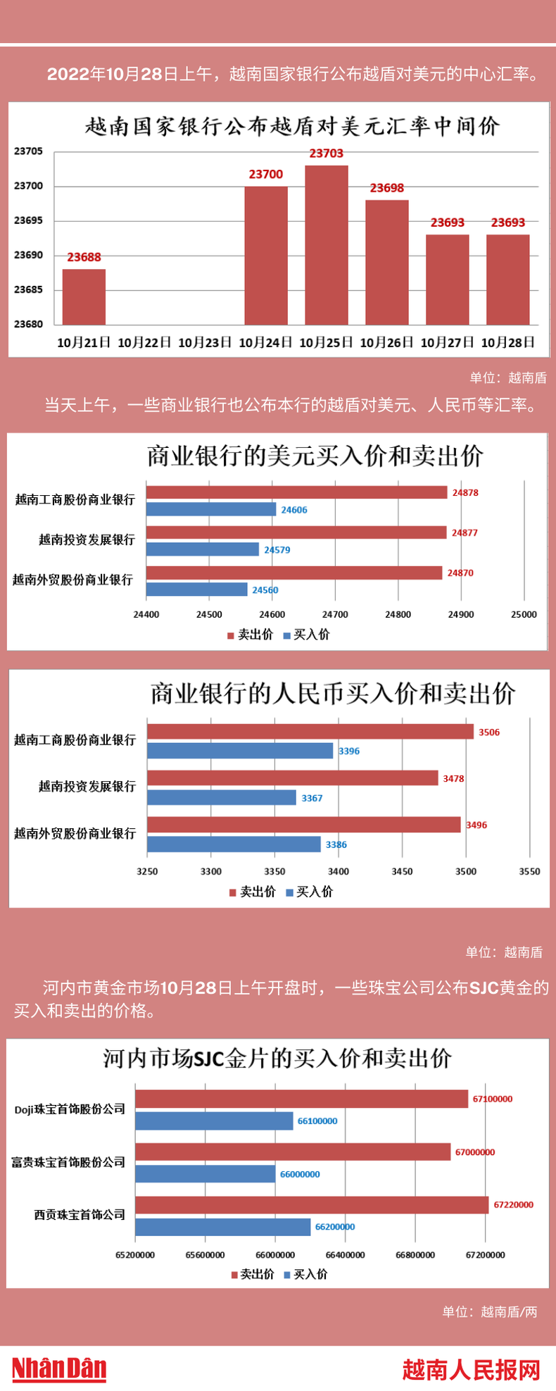 2022年10月28日上午,越南国家银行所公布的越盾对美元的中心汇率为23693。