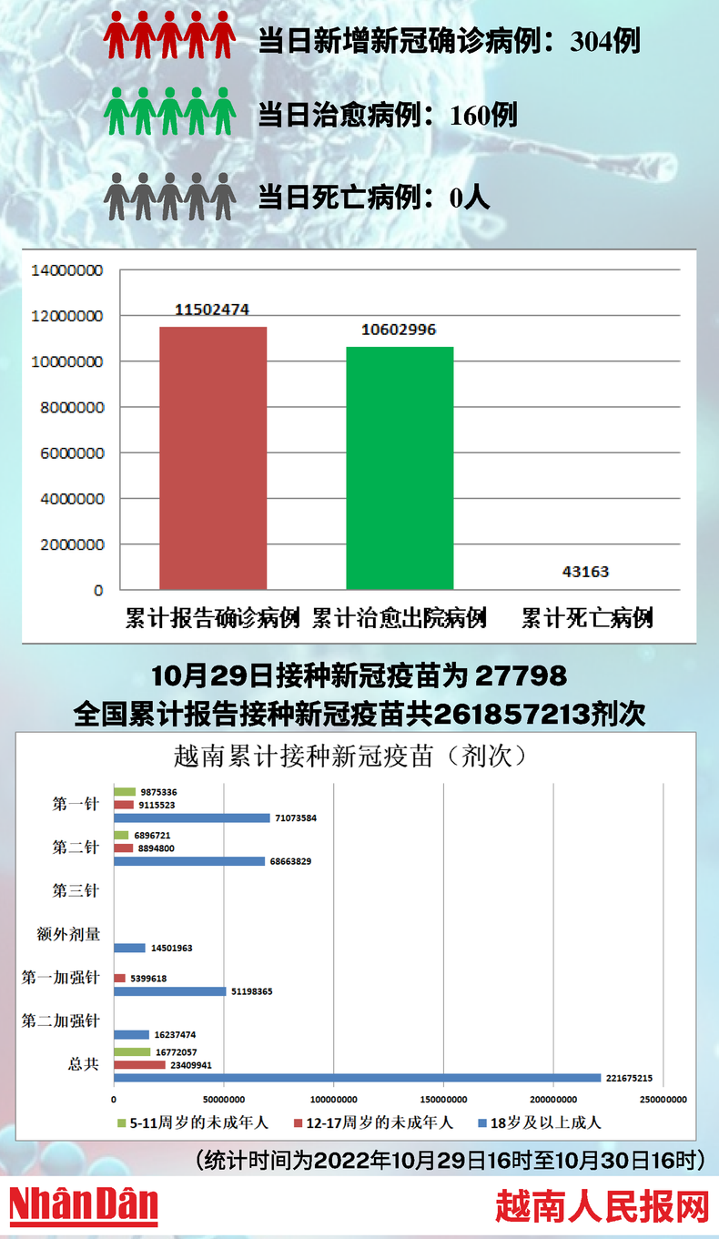 卫生部10月30日下午公布的数据显示,当天,越南新增新冠确诊病例304例。