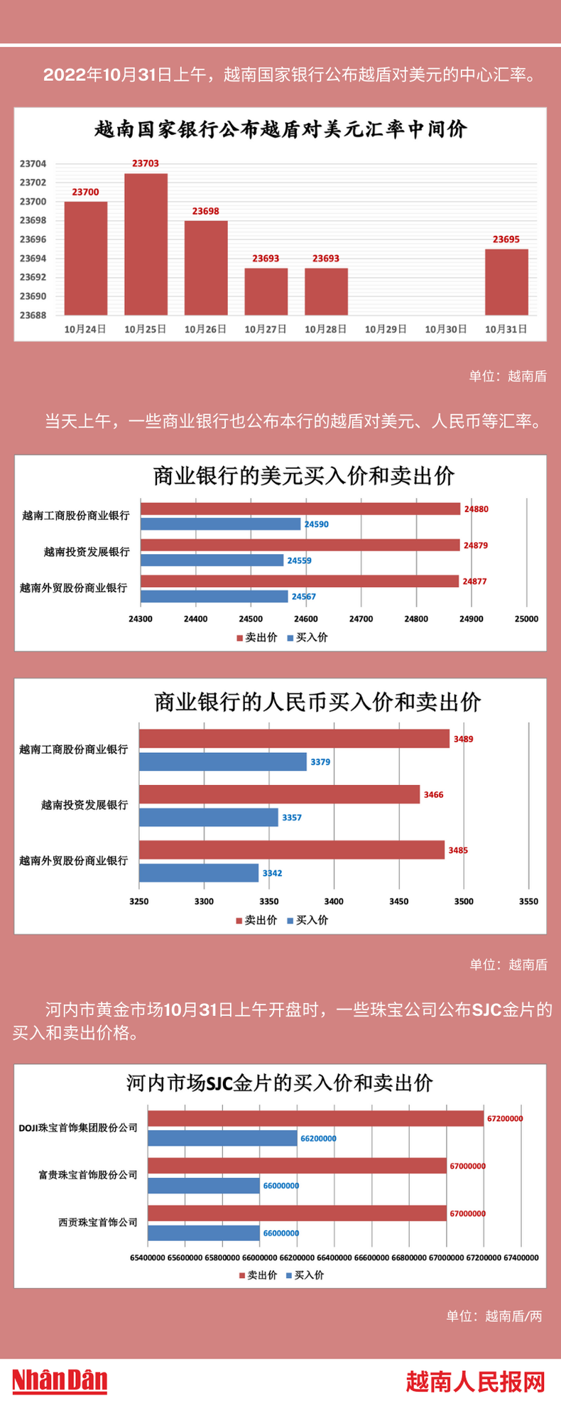 2022年10月31日上午,越南国家银行所公布的越盾对美元的中心汇率为23695。
