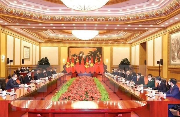 阮富仲总书记和中共中央总书记、中国国家主席习近平举行会谈。(图片来源:越通社)
