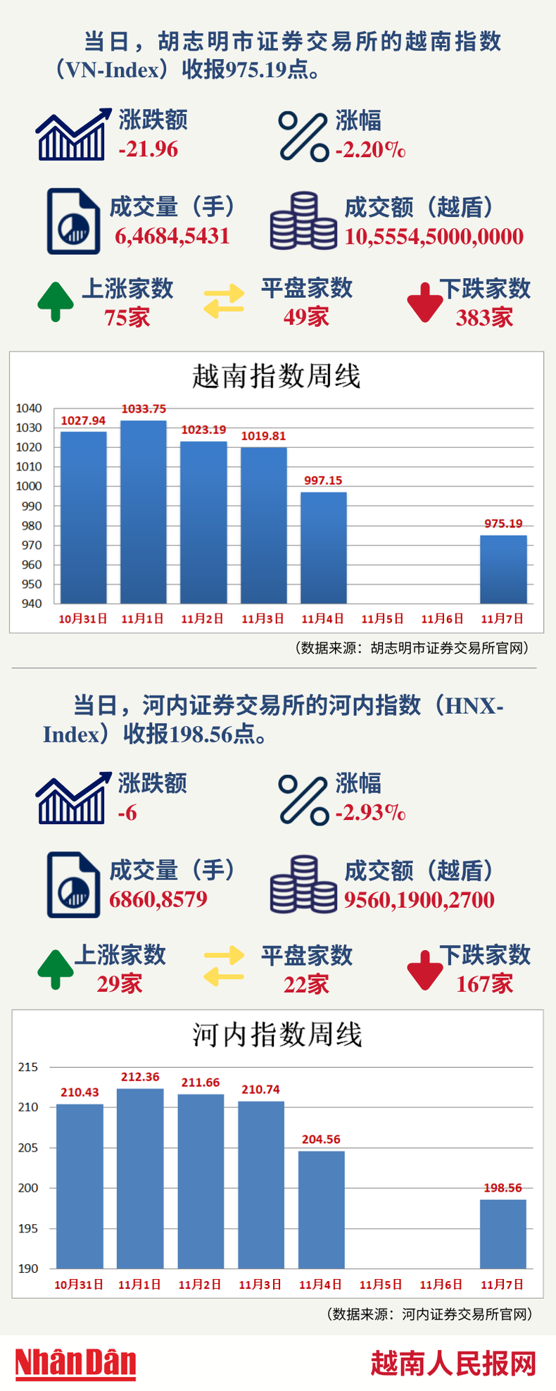 当天,胡志明市证券交易所的越南指数(VN-Index)和河内证券交易所的河内指数(HNX-Index)分别收报975.19点和198.56点。