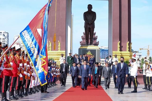 在柬越友谊纪念碑,金边市长在停车处迎接范明正总理,并陪同他步入纪念碑。