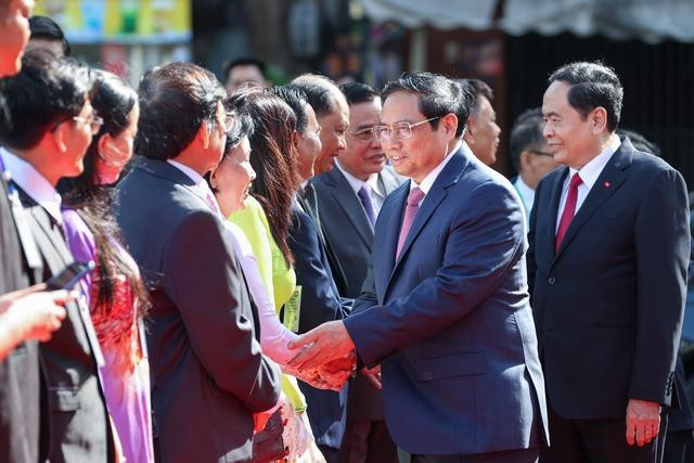 范明正总理与出席向柬越友谊纪念碑敬献花篮仪式的旅柬越南人代表亲切握手。