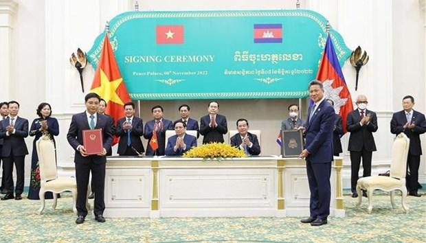 会谈后,两位总理见证了两国之间11项合作文件的签署:其中包括《关于实施公路运输议定书和协定的商用车数量和种类的谅解备忘录》、《关于农业领域合作的谅解备忘录》、《边贸协定》、《对欧洲理事会和欧洲议会关于欧盟 涉及自行车零部件部分条款实施细则的952/2013号条例补充并于2015年7月28日颁布的2015/2446号条例第56条(1)(2)框架内的行政合作协议》、 《按照2020年海关规定18(3)(B)的行政合作协议(计税商品原产地:贸易计划)》、《广播与电视合作协议(2022-2025年)》、《邮政、电信、信息技术和数字化转型领域合作谅解备忘录》、《越南社会主义共和国民族委员会与柬埔寨王国宗教礼仪部之间的双边合作谅解备忘录》、《劳工领域合作谅解备忘录》、《金融创新和支付系统合作谅解备忘录》、《越南军队电信集团(Viettel)下属柬埔寨公司(Metfone)与柬埔寨邮电部之间的合作谅解备忘录》。(完)