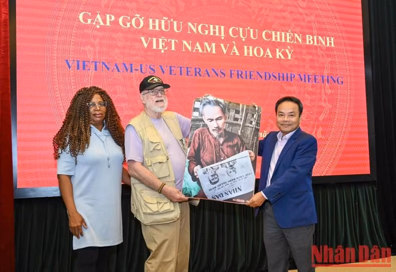 越美两位退伍军人亲切地握手。(维玲 摄)