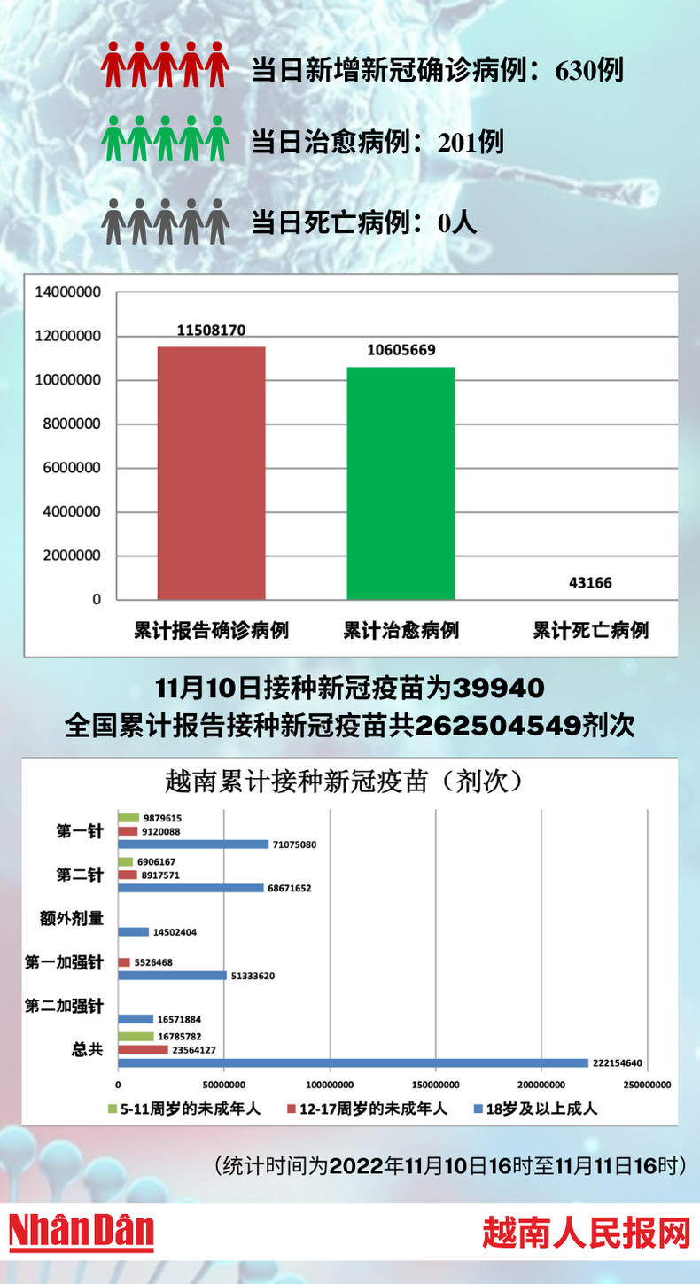 越南卫生部11月11日下午公布的数据显示,当天,越南新增新冠确诊病例630例。