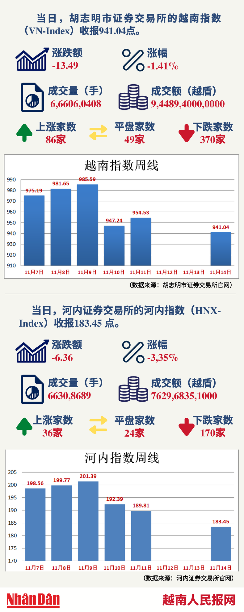 当天,胡志明市证券交易所的越南指数(VN-Index)和河内证券交易所的河内指数(HNX-Index)分别收报941.04点和183.45点。