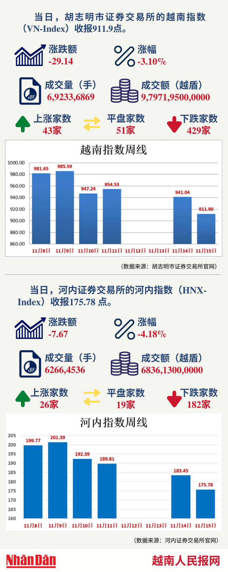 当天,胡志明市证券交易所的越南指数(VN-Index)和河内证券交易所的河内指数(HNX-Index)分别收报911.9点和175.78点。