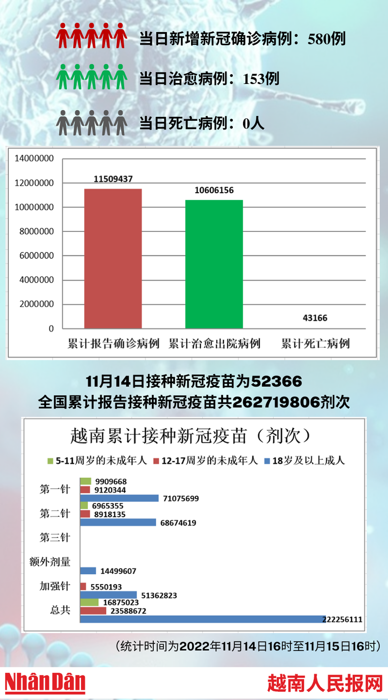 据越南卫生部11月15日下午公布的信息,当天越南新增新冠肺炎确诊病例为580例,新增治愈病例153例,无死亡病例。