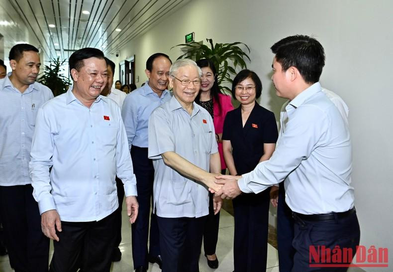 | 越共中央总书记阮富仲出席河内市一号选举单位会见选民活动。 |