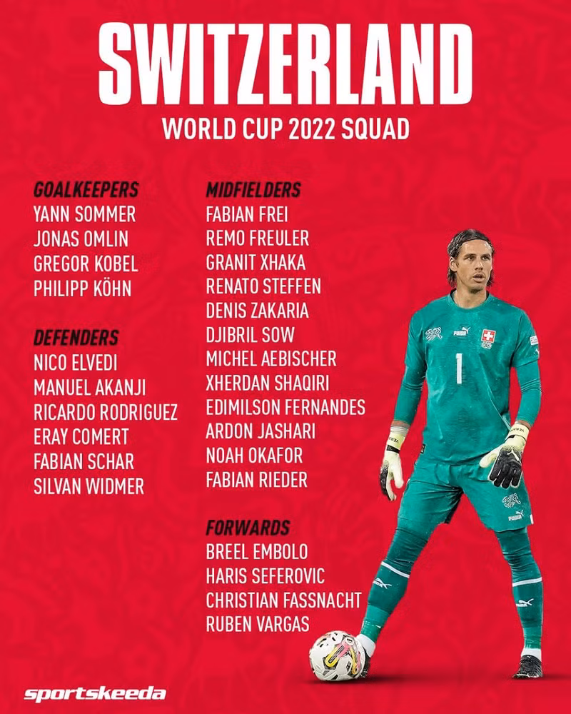 门将:扬·索默(Yann Sommer)、格雷戈·科贝尔(Gregor Kobel)、乔纳斯·奥姆林(Jonas Omlin)、菲利普·库恩(Philipp Kohn)