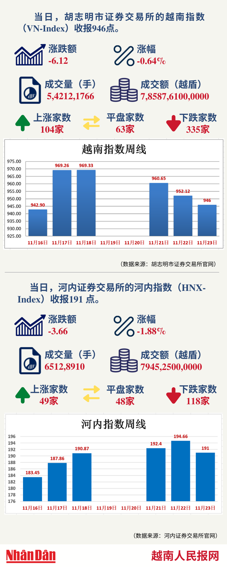 当天,胡志明市证券交易所的越南指数(VN-Index)和河内证券交易所的河内指数(HNX-Index)分别收报946点和191点。