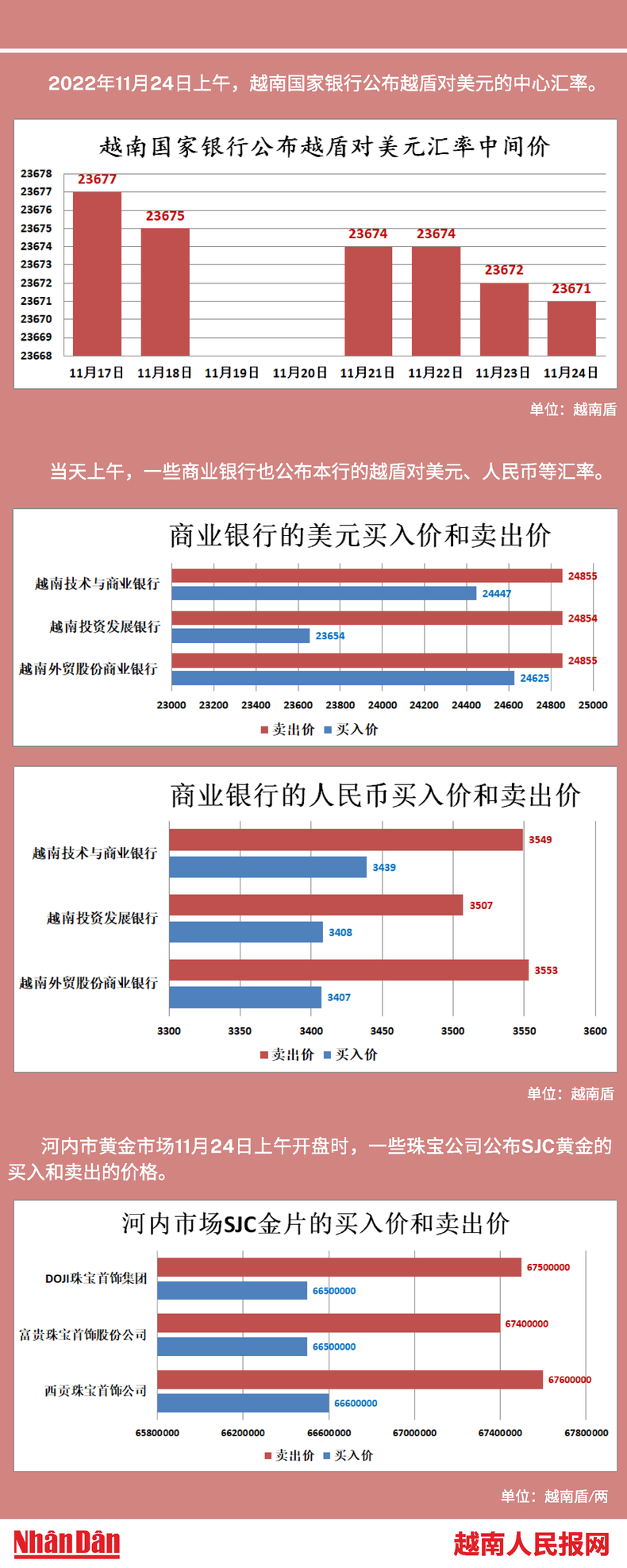 2022年11月24日上午,越南国家银行所公布的越盾对美元的中心汇率为23671。