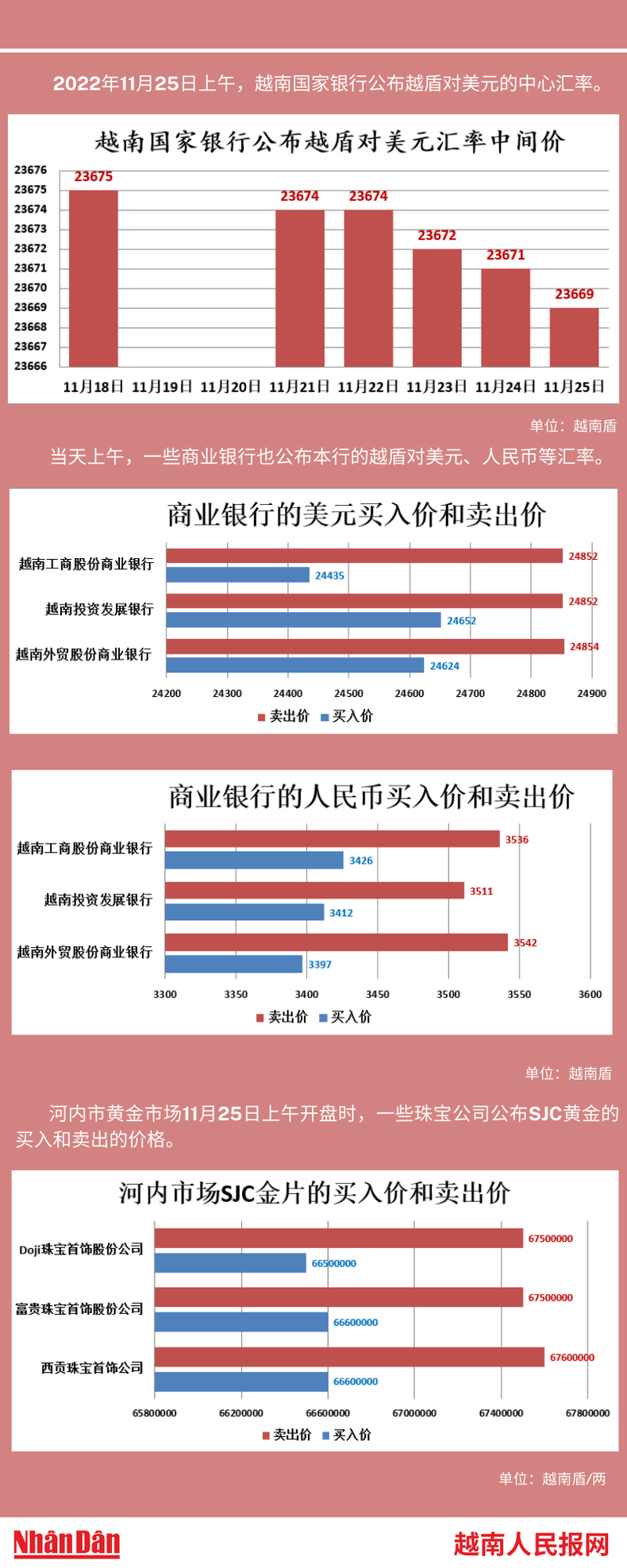 2022年11月25日上午,越南国家银行所公布的越盾对美元的中心汇率为23669。
