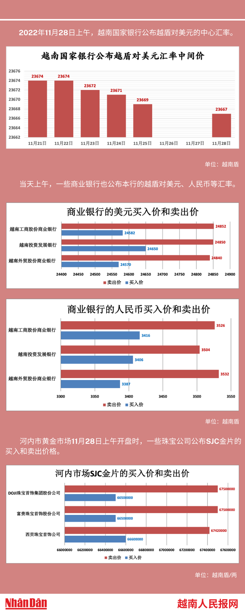 2022年11月28日上午,越南国家银行所公布的越盾对美元的中心汇率为23669。