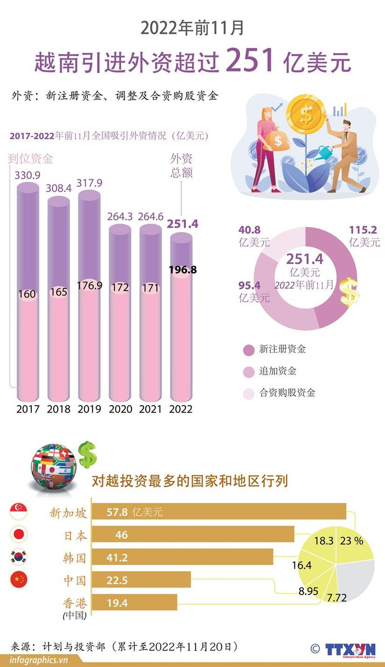 据越南计划投资部境外投资局的报告, 2022年前11个月越南引进外资超过251亿美元。