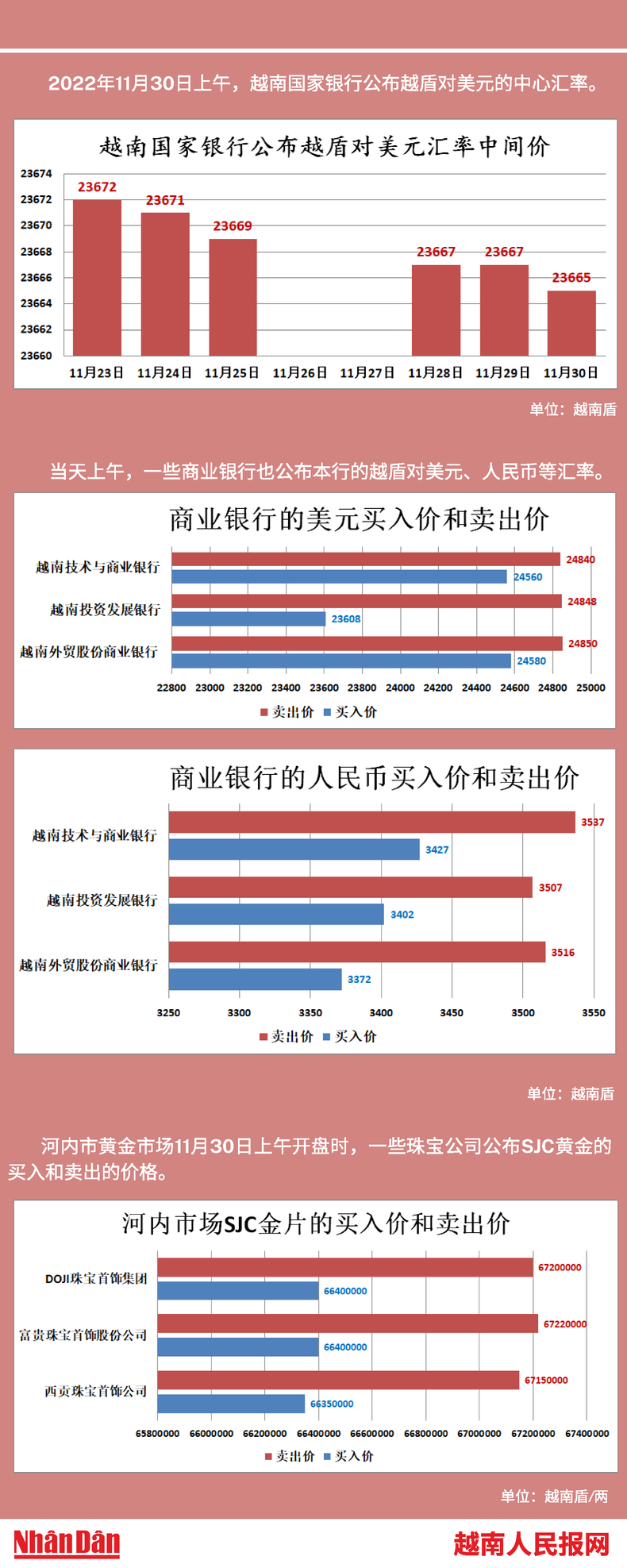 2022年11月30日上午,越南国家银行所公布的越盾对美元的中心汇率为23665。