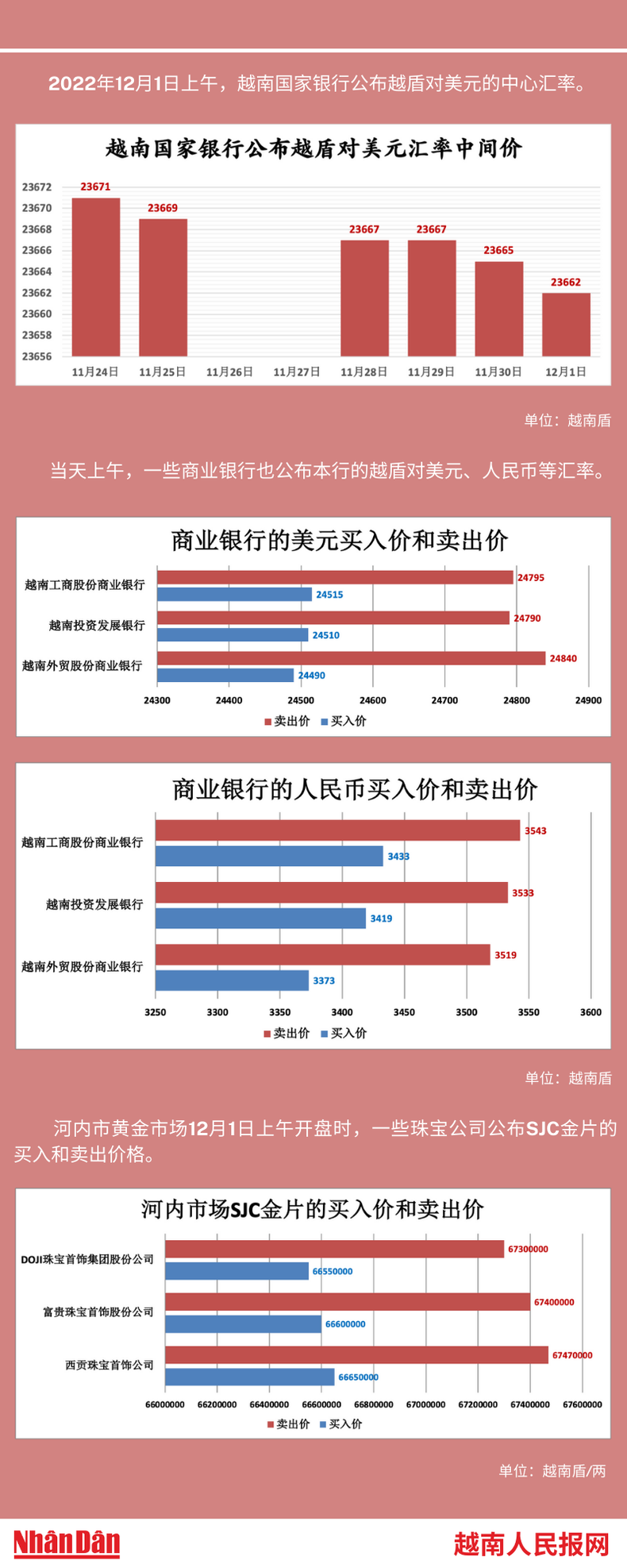 2022年12月1日上午,越南国家银行所公布的越盾对美元的中心汇率为23662。