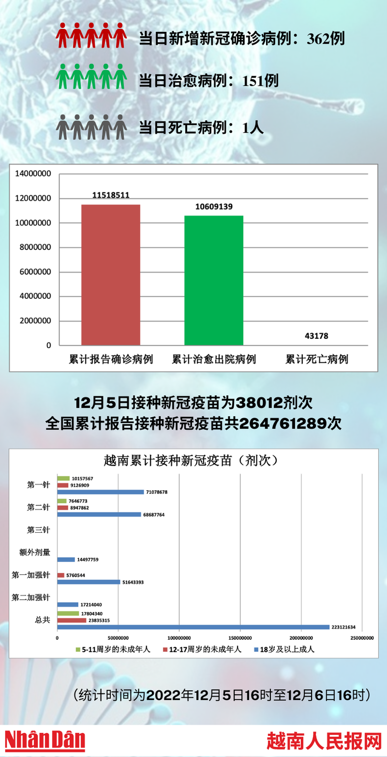据越南卫生部12月6日下午公布的信息,越南新增新冠肺炎确诊病例362例,新增死亡病例1例(在西宁省)。