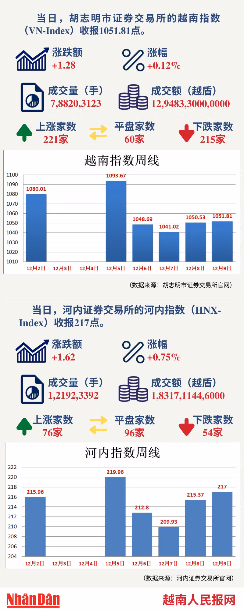 当天,胡志明市证券交易所的越南指数(VN-Index)和河内证券交易所的河内指数(HNX-Index)分别收报1051.81点和217 点。