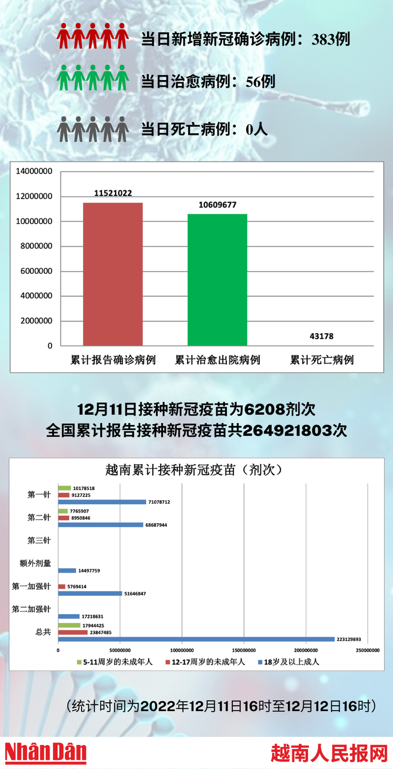 据越南卫生部12月12日下午公布的信息,当天越南新增新冠肺炎确诊病例为383例,新增治愈病例56例,无死亡病例。