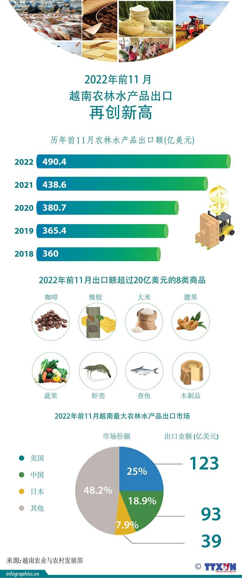 据越南农业与农村发展部的消息,2022年前11个月,越南农、林、水产品进出口总额约900亿美元,同比增长9.5%。其中出口额490亿美元,增长11.8%,进口额约410亿美元,增长6.9%。