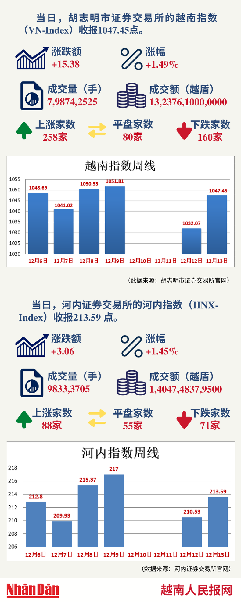 当天,胡志明市证券交易所的越南指数(VN-Index)和河内证券交易所的河内指数(HNX-Index)分别收报1047.45点和213.59点。