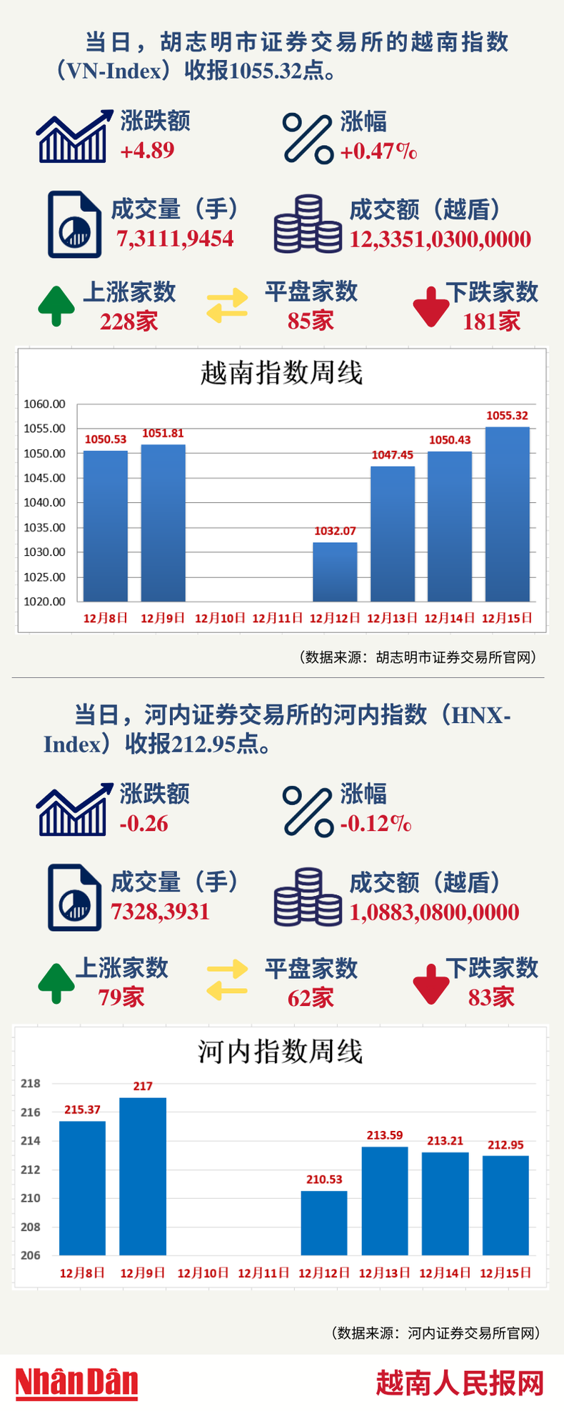 当天,胡志明市证券交易所的越南指数(VN-Index)和河内证券交易所的河内指数(HNX-Index)分别收报1055.32点和212.95点。