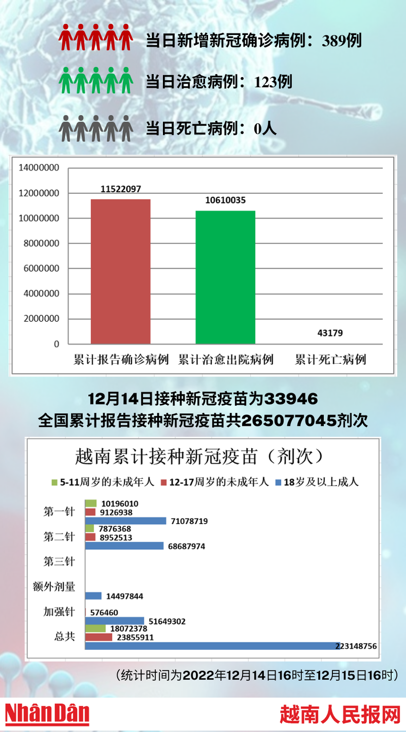 据越南卫生部12月15日下午公布的信息,当天越南新增新冠肺炎确诊病例为389例,新增治愈病例123例,无死亡病例。