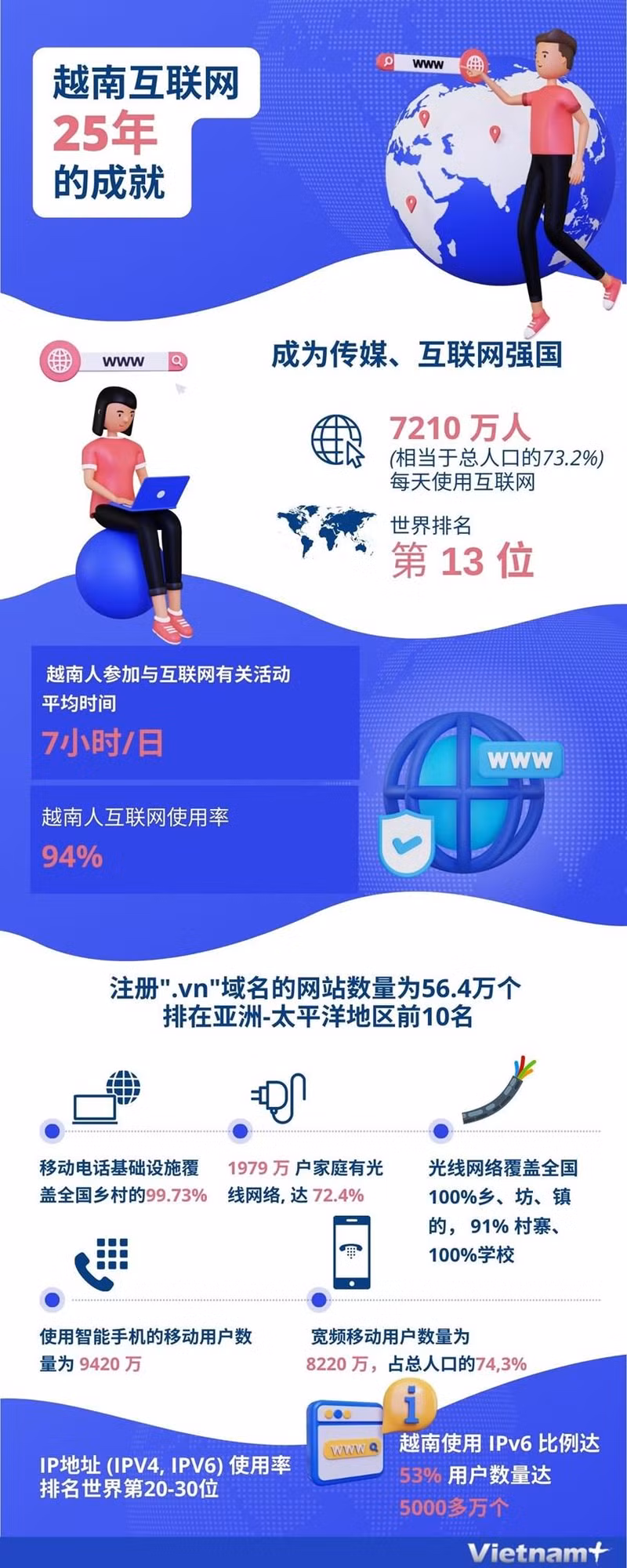 在拥有互联网25年之后,越南已经奋起赶超地区和世界其他国家,已发展成为电信强国。互联网已经成为人们生活中不可或缺的要素、经济的基础设施和推动国家工业化和现代化的重要因素。