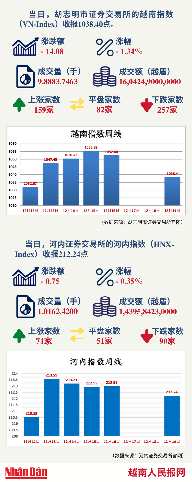 当天,胡志明市证券交易所的越南指数(VN-Index)和河内证券交易所的河内指数(HNX-Index)分别收报1038.40点和212.24点。