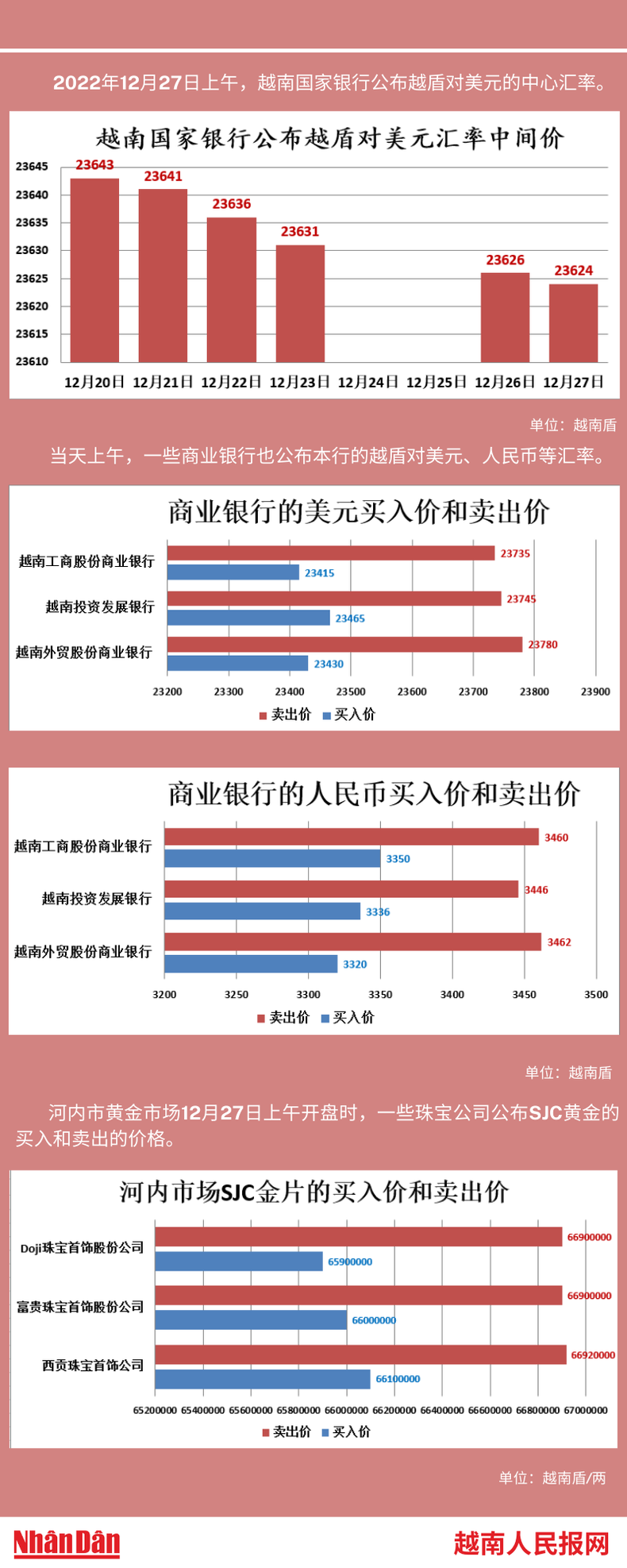2022年12月27日上午,越南国家银行所公布的越盾对美元的中心汇率为23624。