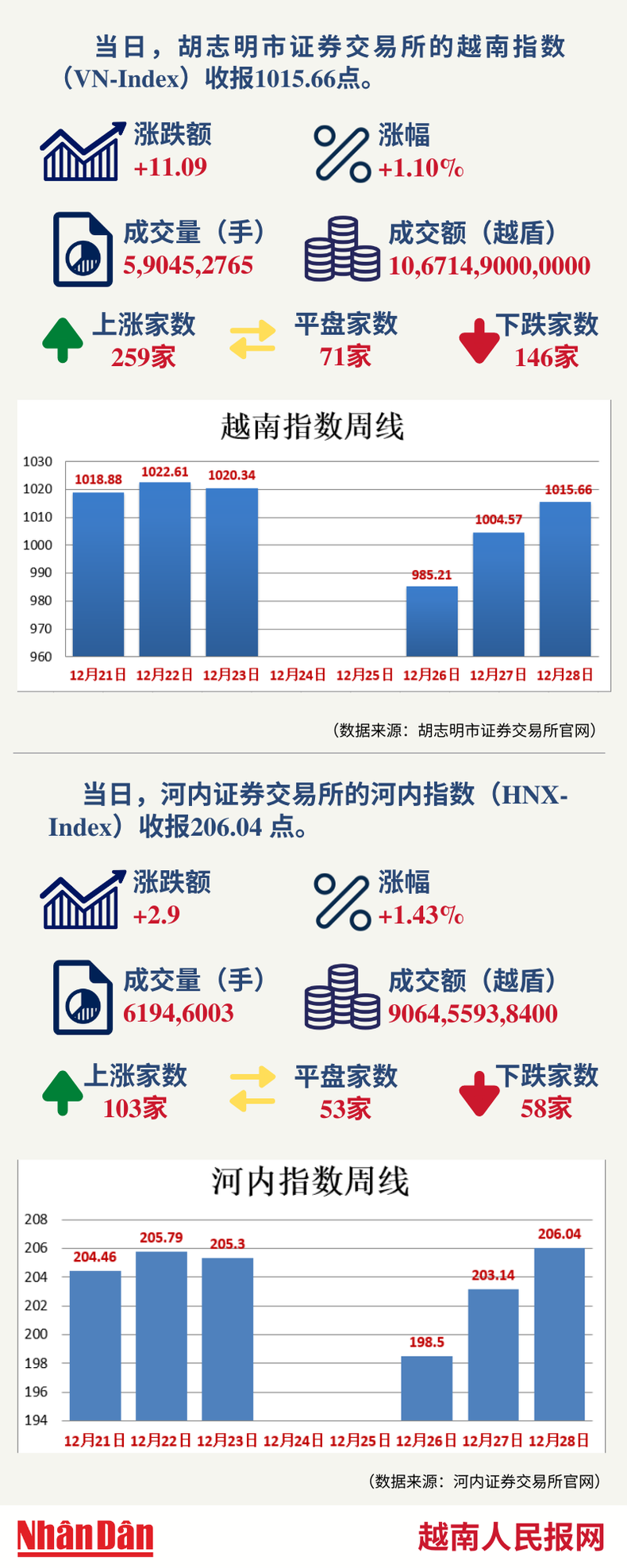 当天,胡志明市证券交易所的越南指数(VN-Index)和河内证券交易所的河内指数(HNX-Index)分别收报1015.66点和206.04点。