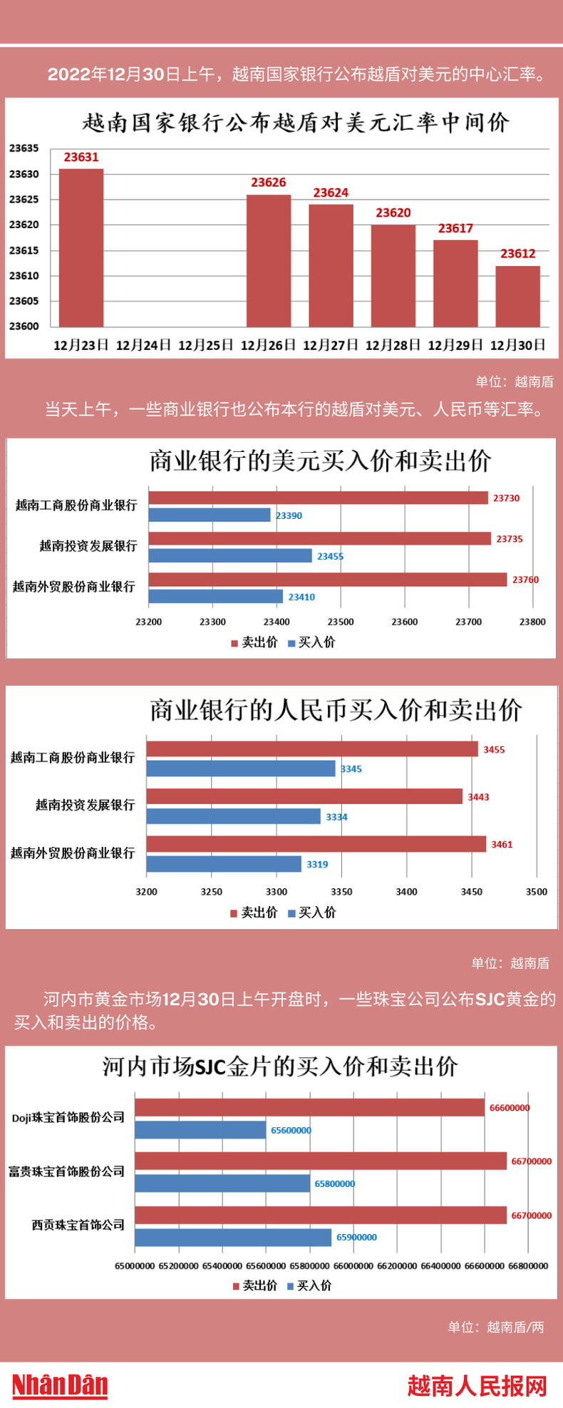 2022年12月30日上午,越南国家银行所公布的越盾对美元的中心汇率为23612。