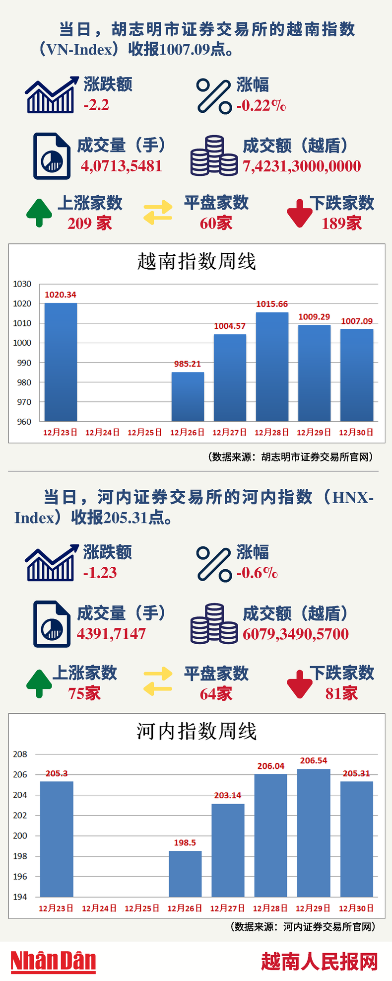 当天,胡志明市证券交易所的越南指数(VN-Index)和河内证券交易所的河内指数(HNX-Index)分别收报1007.09点和205.31点。