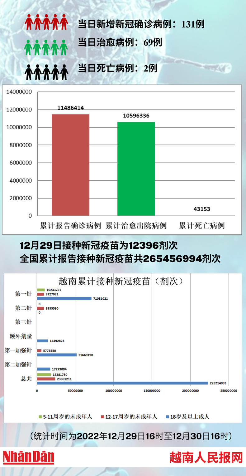 据越南卫生部12月30日下午公布的信息,当天越南新增新冠肺炎确诊病例131例,治愈病例69例,新增死亡病例2例。