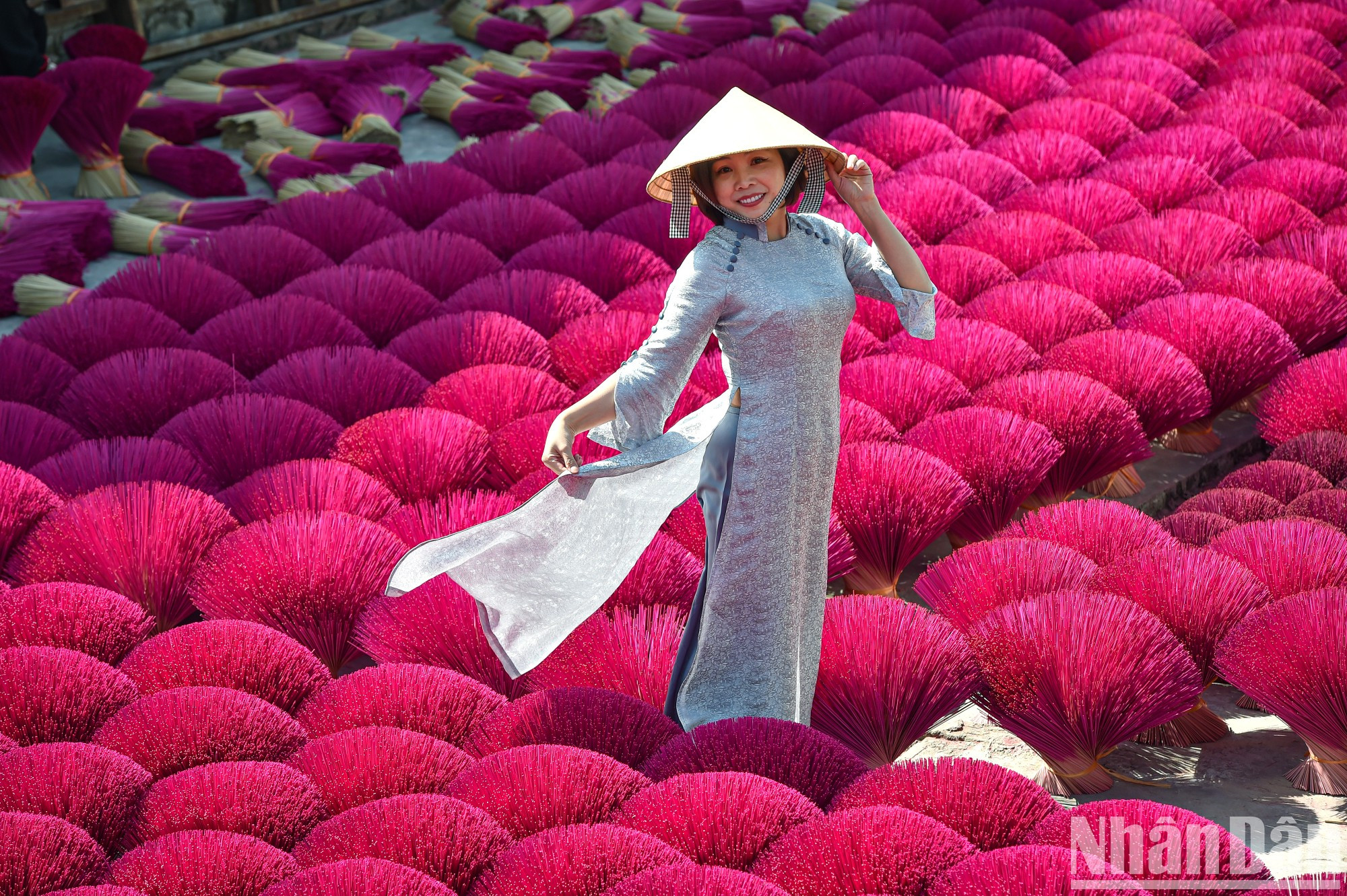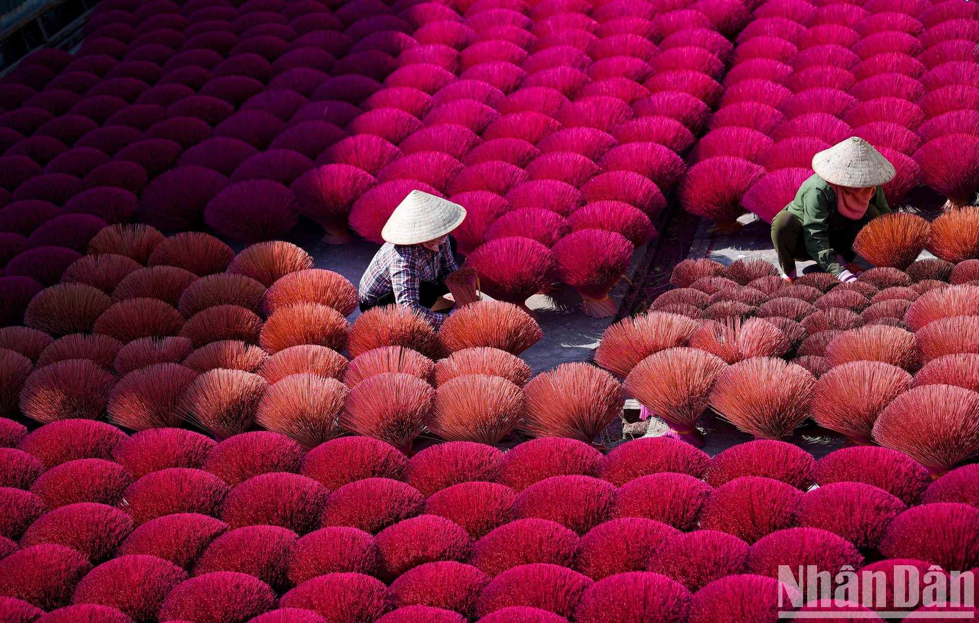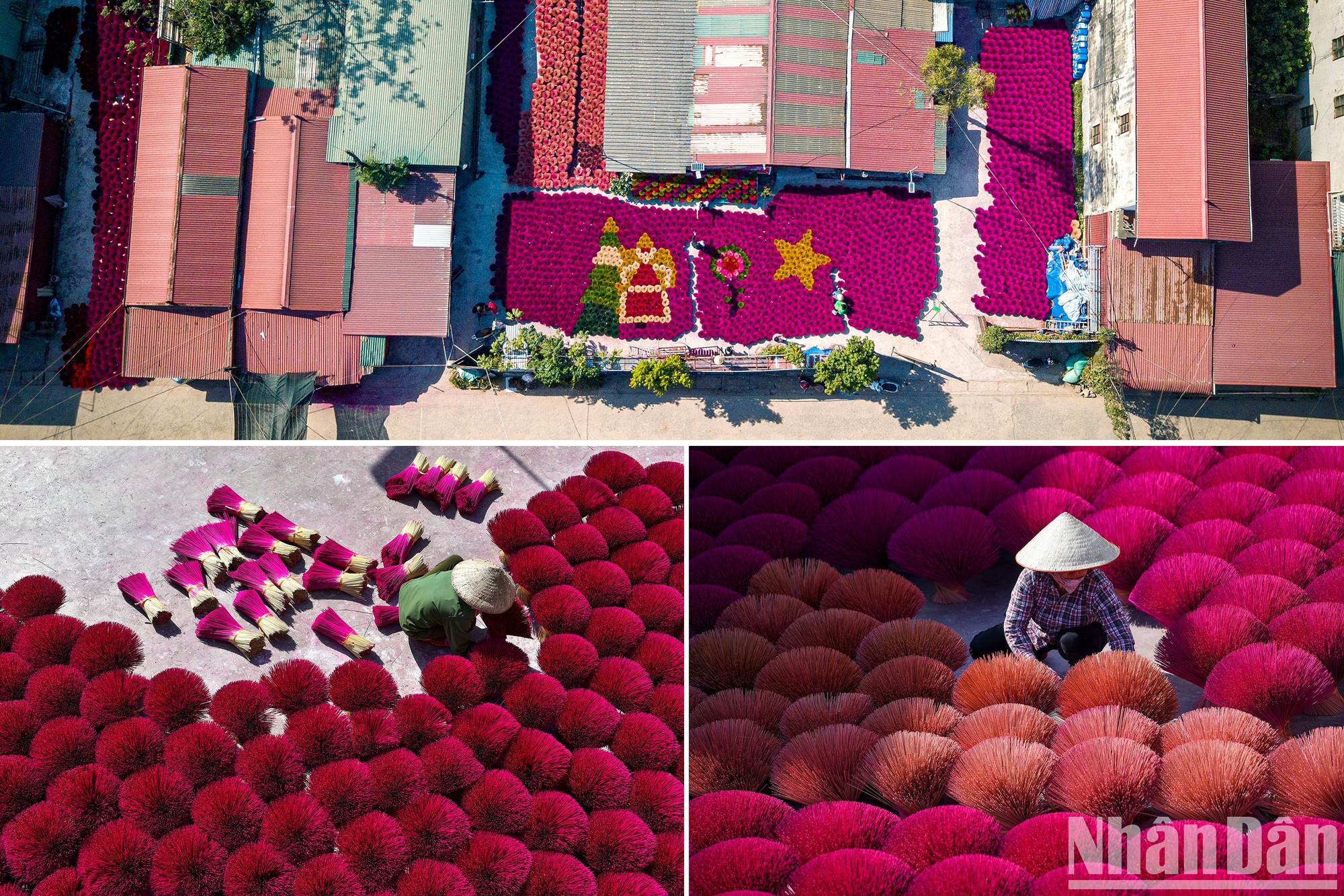 | 当地人用肉桂粉、稻壳和锯末的混合物来制作香棒。工人摆放成千上百束色彩明艳的香棒。 |