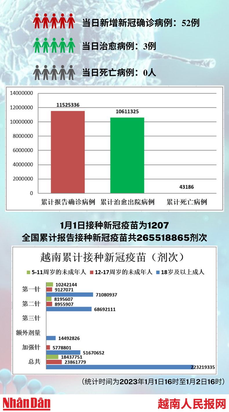 据越南卫生部1月2日下午公布的信息,当天越南新增新冠肺炎确诊病例为52例,新增治愈病例3例,无死亡病例。
