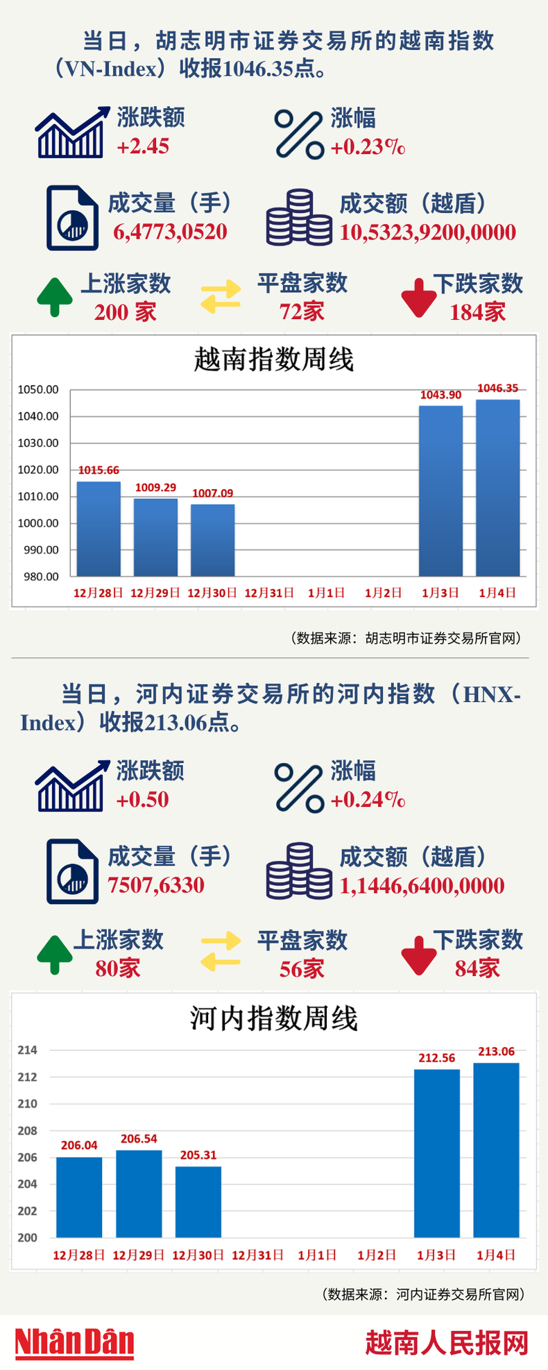 当天,胡志明市证券交易所的越南指数(VN-Index)和河内证券交易所的河内指数(HNX-Index)分别收报1046.35点和213.06点。