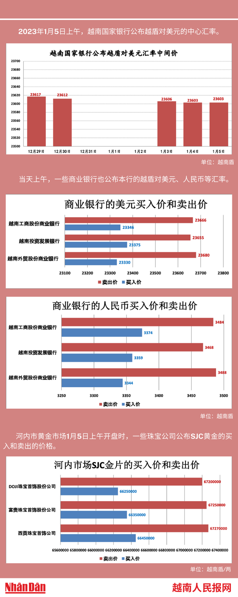 2023年1月5日上午,越南国家银行所公布的越盾对美元的中心汇率为23603。