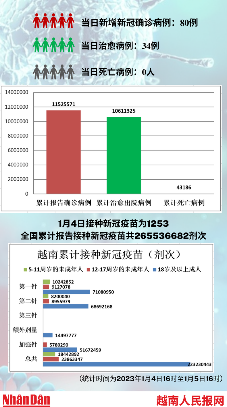 据越南卫生部1月5日下午公布的信息,当天越南新增新冠肺炎确诊病例为80例,新增治愈病例34例,无死亡病例。