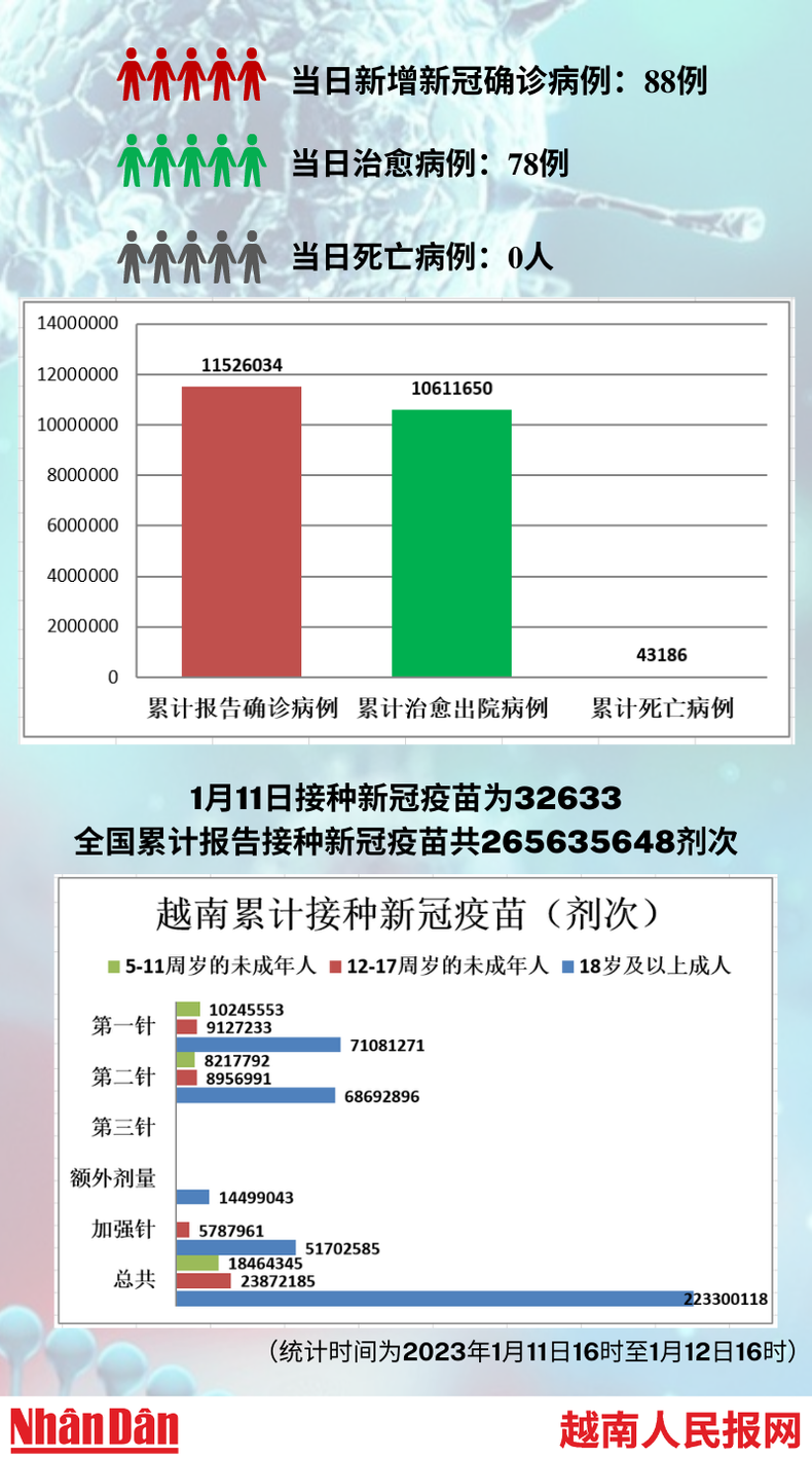 据越南卫生部1月12日下午公布的信息,当天越南新增新冠肺炎确诊病例为88例,新增治愈病例78例,无死亡病例。