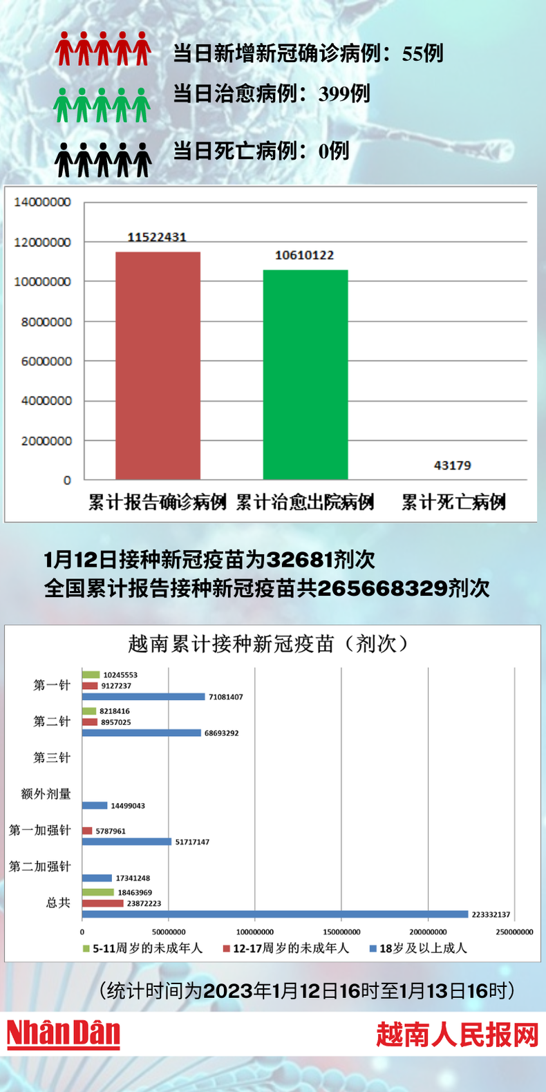 据越南卫生部1月13日下午公布的信息,当天越南新增新冠肺炎确诊病例55例,治愈病例399例,无新增死亡病例。