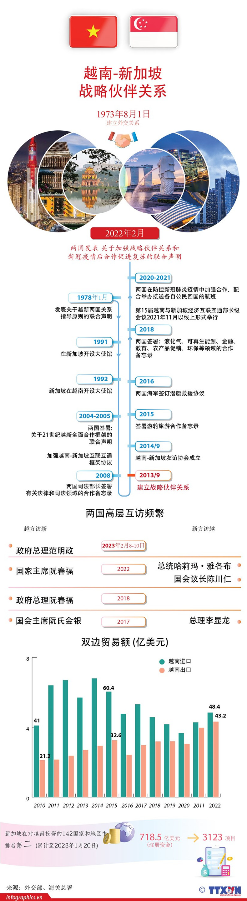 越南和新加坡于1973年8月正式建立外交关系。自此以来,两国关系迈出了良好和全面的发展步伐。