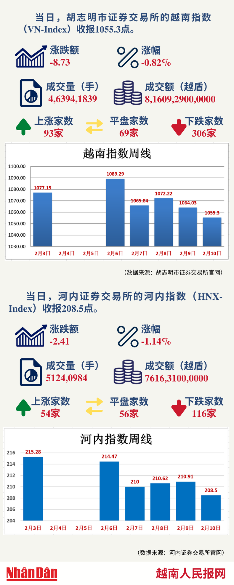 当天,胡志明市证券交易所的越南指数(VN-Index)和河内证券交易所的河内指数(HNX-Index)分别收报1055.3点和208.5点。