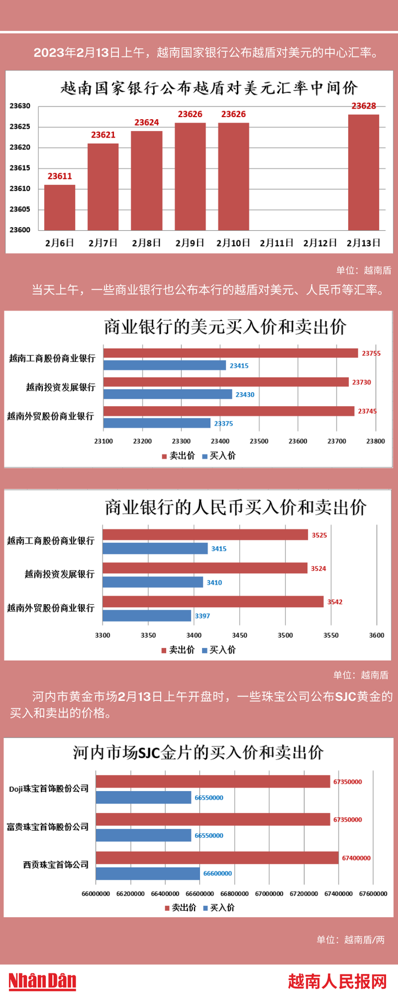 2023年2月13日上午,越南国家银行所公布的越盾对美元的中心汇率为23628。