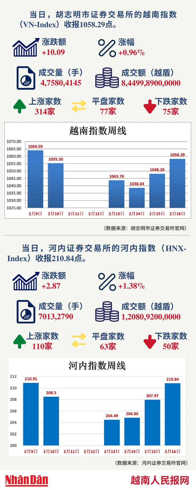 当天,胡志明市证券交易所的越南指数(VN-Index)和河内证券交易所的河内指数(HNX-Index)分别收报1058.29点和210.84点。