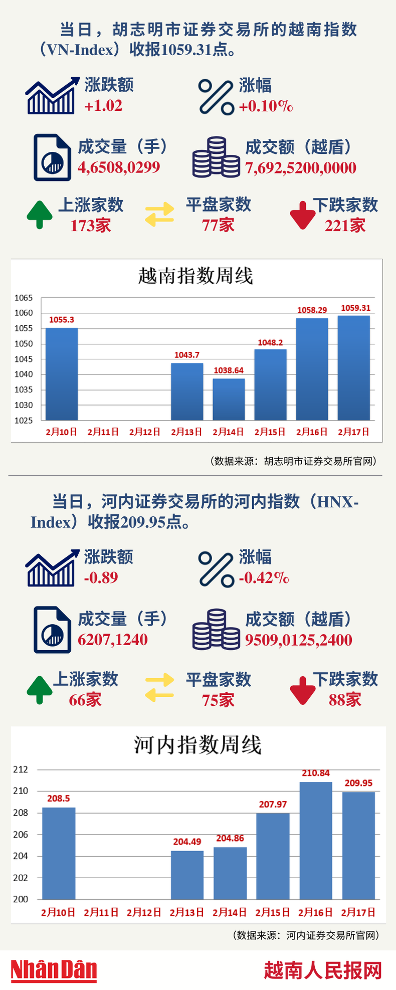 当天,胡志明市证券交易所的越南指数(VN-Index)和河内证券交易所的河内指数(HNX-Index)分别收报1059.31点和209.95点。